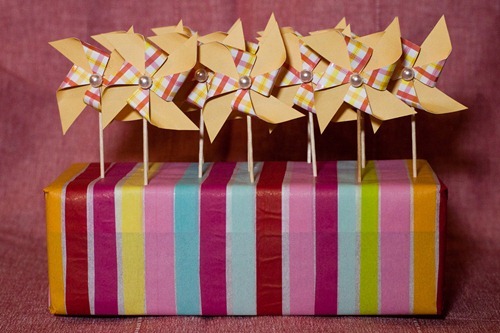 We can see 100 uses for these! Who doesn't love pinwheels? You could adjust this same idea for place card holders, hand made cards, larger toy versions, home decor...have fun!